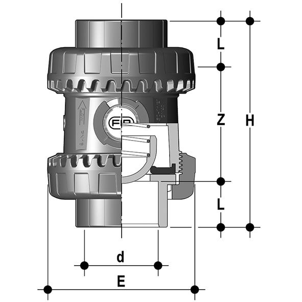 PVC-U Federrueckschlagventil,Klebemuffen , radial ein- u. ausbau SSEIV/EPDM d 16